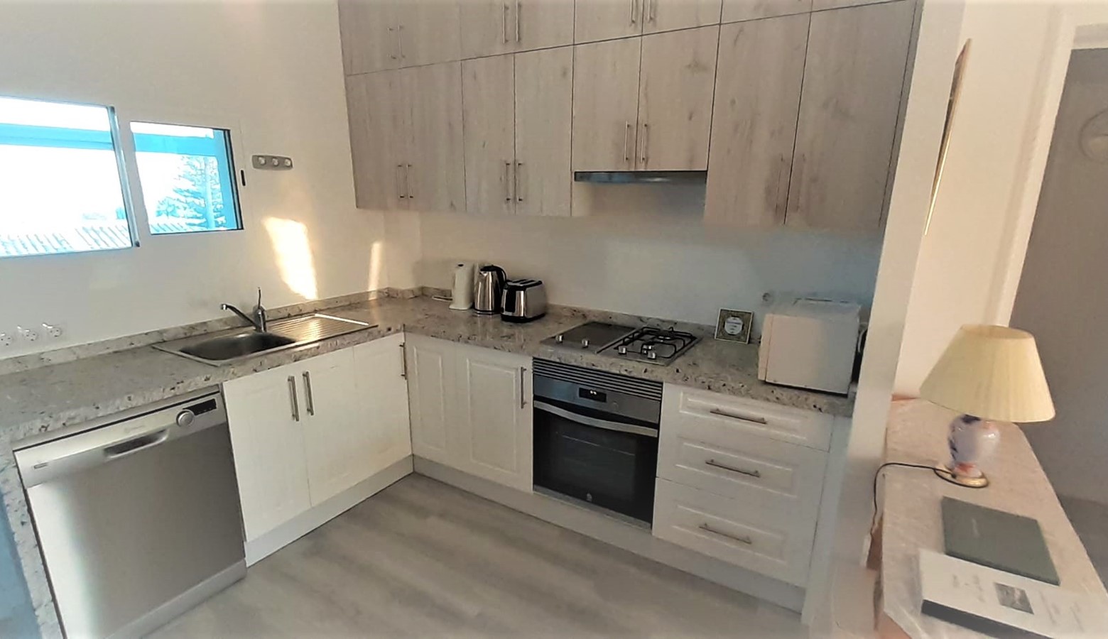The living room is airconditioned and has a large sofa, which opens out into a comfortable double sofa bed. The lounge opens out onto the terrace which provides views of the pool, garden and the sea. The sea is also visible from the kitchen.